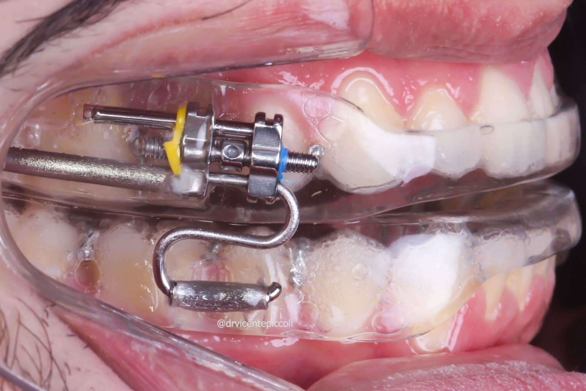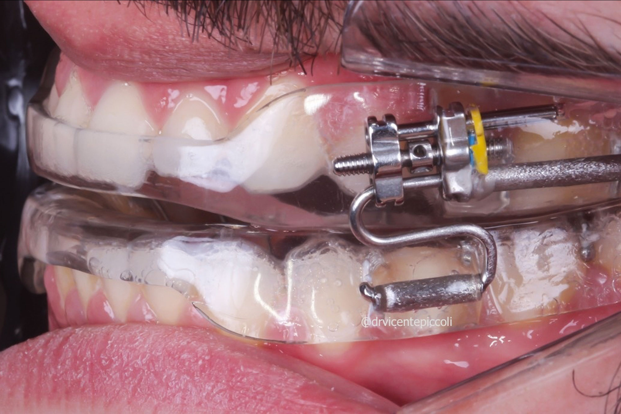 O aparelho intraoral é um pequeno dispositivo que se encaixa sobre os dentes enquanto você dorme, impedindo ou diminuindo o ronco. Se assemelha a um protetor bucal esportivo ou a um aparelho para bruxismo. O dispositivo de avanço mandibular projeta a mandíbula para frente, aumentando o volume do espaço aéreo, permitindo que o paciente respire melhor durante o sono. Ele é usado durante o sono e é de fácil instalação e remoção pelo próprio usuário. Existem muitos tipos de aparelhos para o ronco, nem todos com a mesma eficácia. Procure um dentista com formação em odontologia do sono para instalar o aparelho intraoral para o ronco em você. O tratamento deve ser monitorado e os retornos devem ser estabelecidos pelo dentista.